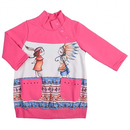 Комфортное платье приятной расцветки с длинным рукавом для девочки выполнено из качественного материала (футер). Модель дополнена тремя боковыми застежками на кнопках, карманами, необычной красочной печатью и стразами. Такое платье прекрасно подойдет на каждый день.