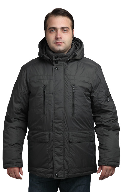 Куртка с капюшоном прямого покроя, выполнена из нейлона на синтепоне. Цветовые варианты - черный, хаки, темно-серый. Две глянцевые кнопки украшают верх и низ планки от скрытой молнии-застежки, пара таких же кнопок - на воротнике-стойке. Крупные боковые накладные карманы декорированы мелкой отстрочкой. На груди - два вертикальных кармана на молниях, и такой же кармашек - на рукаве.