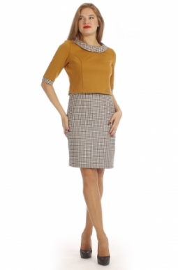 Модное платье - имитация костюма. Коротенький жакет выполнен из плотного трикотажного полотна, юбка из ткани в мелкую клетку. Круглый отложной воротник и манжеты придают законченность образу. Для удобства движения юбка со шлицей. Платье полностью на трикотажной подкладке.